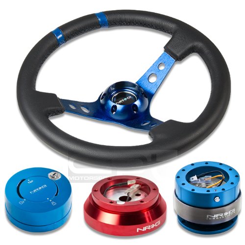NRGSRK140HRD+200NB+101NB+016RBL, NRG Innovations 13.78" 350mm 3" Deep Dish Style Black Leather Blue Center Marking Blue Spokes Racing Steering Wheel Combo with 6 Hole Short Hub Adapter with Gen 2.0 New Blue Quick Release with New Blue Lock Hub Kit SRK-140H