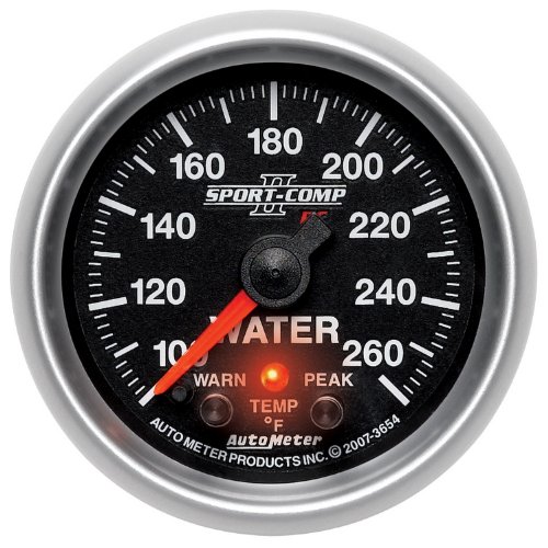 Auto Meter 7655 Sport-Comp II 2-5/8" 100-260 Degree F Full Sweep Electric Water Temperature Gauge with Peak Memory and Warning?Auto Meter 2-5/8 inch (66.7 millimeter) Water Temperature with Peak Memory and Warning, 100-260'F, Full Sweep Electric, Sport-Comp II are powered by digital microprocessor-controlled, rugged stepper motor drives and laboratory grade sending units. These Full Sweep Electric Gauges are the BEST gauges available. They combine Extreme Durability and Readability of 270 degree sweep mechanical gauges with the easy installation and safe operation of short sweep electrics. Track tested and race proven, these units use precision senders to keep hazardous fluids out of the driver compartment and perform gauge calibration and sensor diagnostics at power up for extreme accuracy, every time. Most units compatible with Auto Meter Data Logger for the ultimate race info center. Full Sweep, Stepper Motor meter movement. Includes 8 ft. tubing or wiring harness and 1/8 inch NPT Sender. Peak recall/memory. User Progra millimeterable Warning Function.